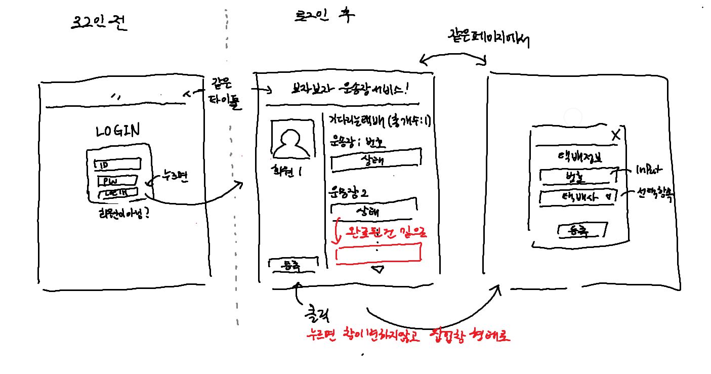 서비스 제목: 보자보자 운송장 서비스! (운송장 등록&관리 서비스) 기획 이미지(와이어프레임): 구성페이지: 로그인 페이지 - 회원가입 페이지 - 로그인 후 회원 전용 페이지/운송장 등록 페이지